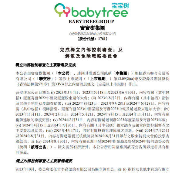 12月2日,宝宝树发布公告称,公司法务风控中心内控管理部在专业服务机构的协助下,依据适用的企业内部控制规范体系及上市规则,对独立调查员提出的内部控制缺陷该公司所实施补救措施情况进行验证。经过验证,在公告发布日,该公司已初步完成独立调查员提出的内部控制问题整改。为提高决策效率和简化工作流程,董事会决定即日起解散和免除战略委员会,战略委员会的职能和职责将由董事会接管。