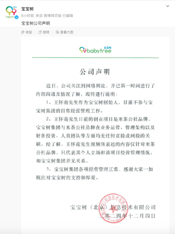 “经了解,王怀南先生视频所表述的内容仅针对米茶公社品牌,只代表其个人立场和该项目经营管理情况,和宝宝树集团并无关系。”