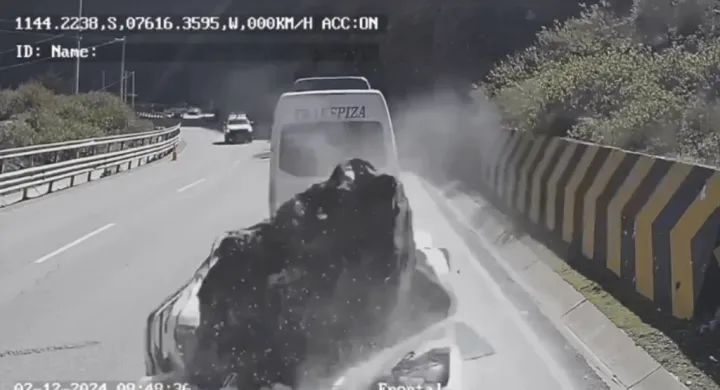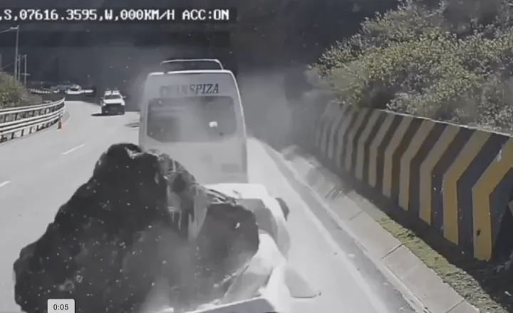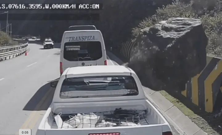 事发地点位于秘鲁瓦罗奇里省一条单线双向的山边公路上,监控画面显示,这辆皮卡车正停靠在路边,突然一块巨大石头从山边滚下,精准砸中。