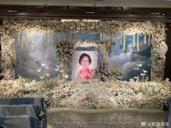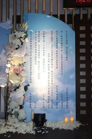 家属选用一张琼瑶穿着红色洋装、露出一抹微笑的照片作为遗照,现场摆满全白花朵,还有蝴蝶“翩然”飞舞。