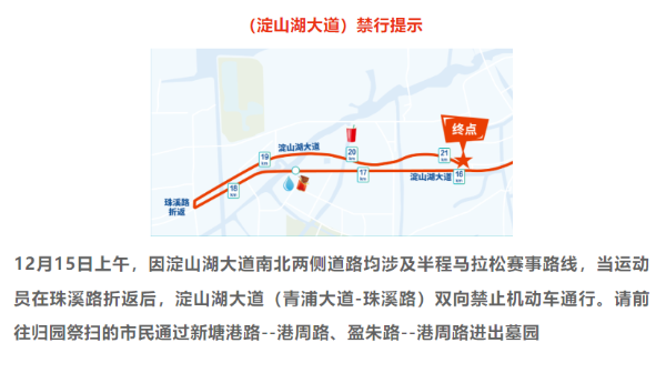 特别提醒前往青浦区淀山湖归园祭扫的市民,12月15日上午,因“长三角·青浦新城半程马拉松”赛事,部分时段淀山湖大道(青浦大道-珠溪路)采取临时交通管制措施:双向禁止机动车通行,市民可通过新塘港路-港周路、盈朱路-港周路进出墓园,此外15日当天无前往淀山湖归园的轨交短驳车。